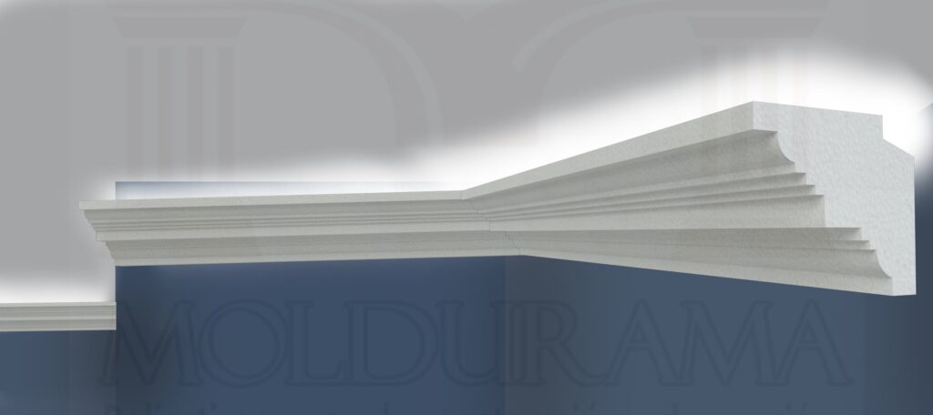 Molduras de unicel con iluminación LED: La unión de estética y funcionalidad. Diseñadas para albergar tiras de LED, estas molduras añaden elegancia moderna a paredes y techos.
