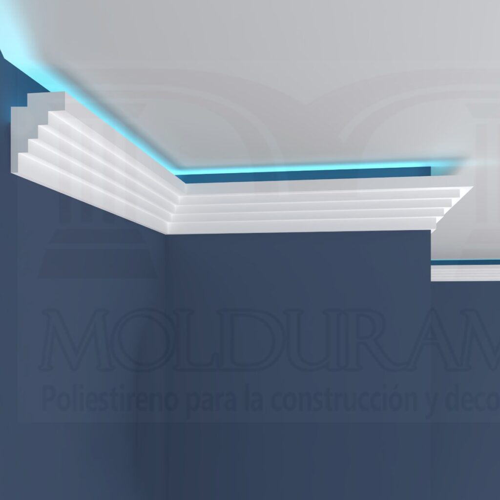 Las molduras de unicel se combinan con tiras de luz LED para lograr elegancia generando una iluminación suave y acogedora, realzando la decoración y creando un ambiente sofisticado.